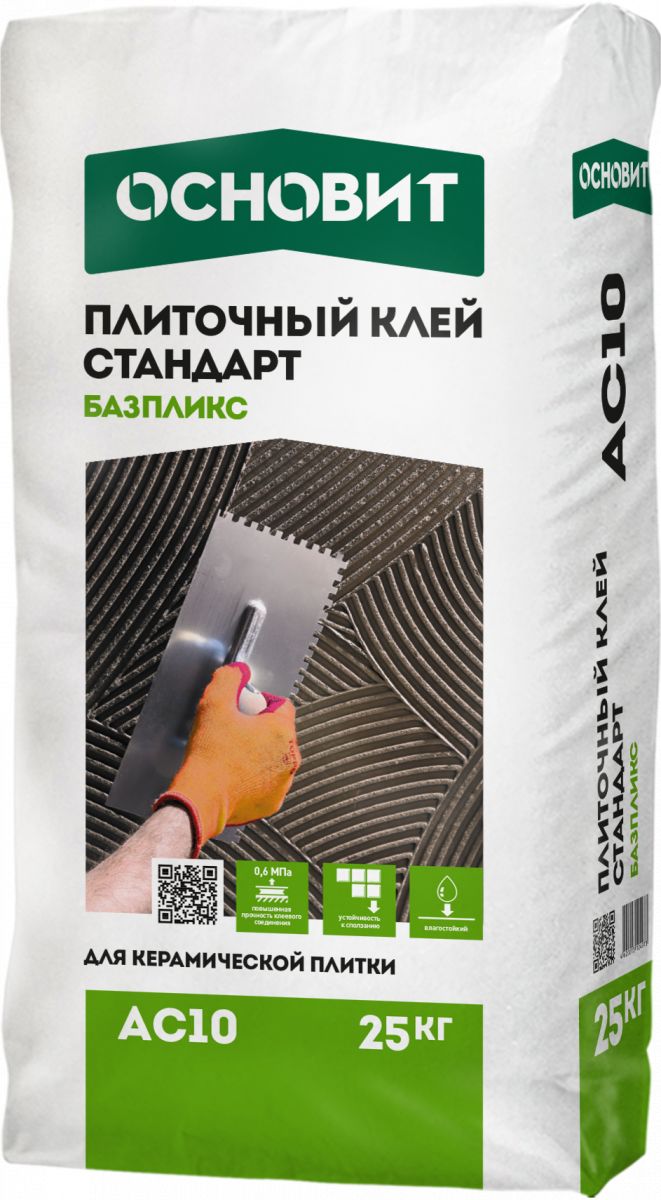 Смесь сухая клеевая на цементном вяжущем C0T, ГОСТ Р 56387-2018. Плиточный клей ОСНОВИТ БАЗПЛИКС АС10 предназначен для облицовки стен и пола керамической плиткой. Для применения внутри помещения. Рекомендуемые основания: Стандартные (бетонные, оштукатуренные, кирпичные) и сложные недеформирующиеся основания (пено- и газобетон, ГКЛ и ГВЛ, ЦСП). Рекомендуемая толщина слоя 2-15 мм
