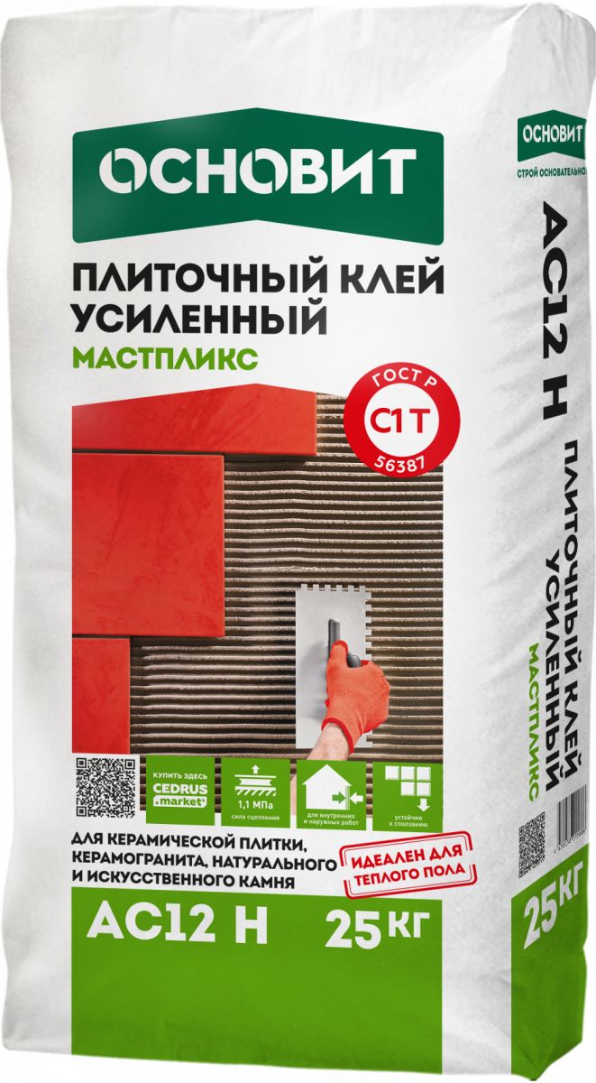 Смесь сухая клеевая на цементном вяжущем C1T, ГОСТ Р 56387-2018. Плиточный клей ОСНОВИТ МАСТПЛИКС АC12 H предназначен для облицовки стен и полов керамической плиткой, керамогранитом, натуральным и искусственным камнем весом до 600г/100см² внутри сухих и влажных жилых и административных помещений. Рекомендуется для облицовки балконов, террас, подвалов. Применяется при устройстве полов с подогревом. Предназначен для отделки фасадов и цоколей без утепления керамической плиткой весом до 600г/100см². Для внутренних и наружных работ. Рекомендуемые основания: Стандартные (бетонные, оштукатуренные, кирпичные) и сложные недеформирующиеся основания (пено- и газобетон, ГКЛ, ГВЛ, ЦСП, ПГП). Рекомендуемая толщина слоя 2-20 мм